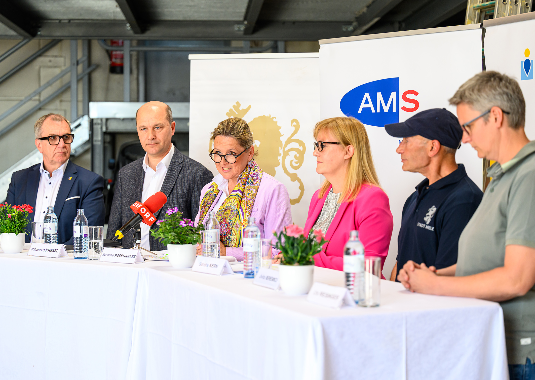 Im Kampf gegen die Langzeitarbeitslosigkeit haben das Land Niederösterreich und das Arbeitsmarktservice (AMS) NÖ mit dem Projekt „Jobchance“ ein bewährtes Sprungbrett ins Erwerbsleben geschaffen. In den niederösterreichischen Gemeinden und im gemeinnützigen Bereich werden heuer 350 befristet geförderte Arbeitsplätze für Jobsuchende der Generation 50 plus und für Wiedereinsteigerinnen bzw. Wiedereinsteiger nach der Familienpause eingerichtet. Eine aktuelle Bilanz zum Projekt und einen Ausblick auf dieses Jahr gaben heute Landesrätin Susanne Rosenkranz, AMS Niederösterreich Landesgeschäftsführerin Sandra Kern, NÖ Gemeindebund Präsident Johannes Pressl, NÖ GVV-Präsident Rupert Dworak, Stadträtin Ute Reisinger und der Teilnehmer Jivita Ieremici des Projektes „Jobchance“ bei einer Pressekonferenz im Wirtschaftshof der Stadtgemeinde Melk.